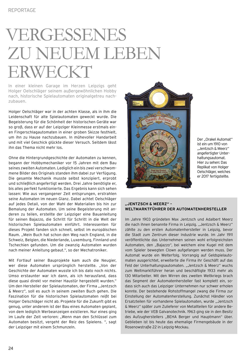 Einige der hier vorgestellten und weitere historischen Spiel- automaten konnte man noch vor wenigen Jahren auf Rummel- plätzen finden. So zum Beispiel letztmalig 2011 auf der Leipziger Kleinmesse. Danach wurde das Geschäft leider aufgelöst, die Spielautomaten verkauft und die originelle Spielhalle wird nun als Lagerraum genutzt. Damit verschwand zum großen Bedauern der letzte Zeitzeuge aus der ehemaligen Automaten- hauptstadt.