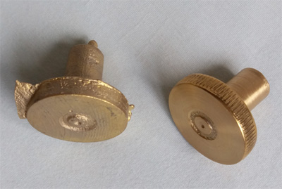 Nachempfundener Drehknauf, so wie er häufig bei verschiedenen Automaten der Firma Jentzsch & Meerz zum Einsatz kam. (links: Rohguss rechts: fertig bearbeitet mit Rändelung)