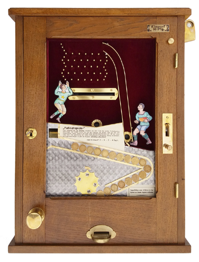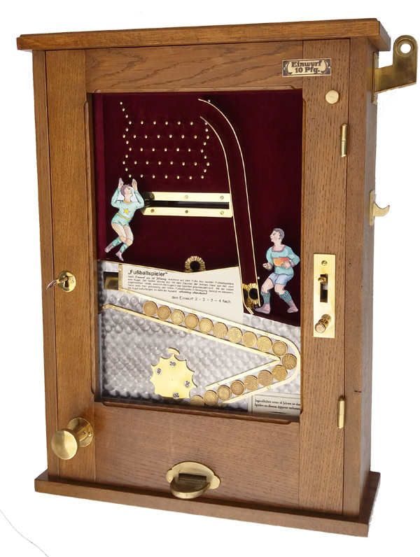 Der Spielautomat >Fußballspieler< stellt eine Variante eines Kugelschleuderspielgerätes dar. Nach Einwurf einer Spielmarke wird eine Spielkugel ausgelöst, welche an dem unteren Ende der Laufschiene erscheint und sich vor den Fuß der rechten Figur setzt. Man versuche durch drücken auf den an der rechten Seite befindlichen Schnapper die Kugel entsprechend hoch zu schleudern und mit der beweglichen Figur durch drehen des unten links befindlichen Knopfes dieselbe aufzufangen.