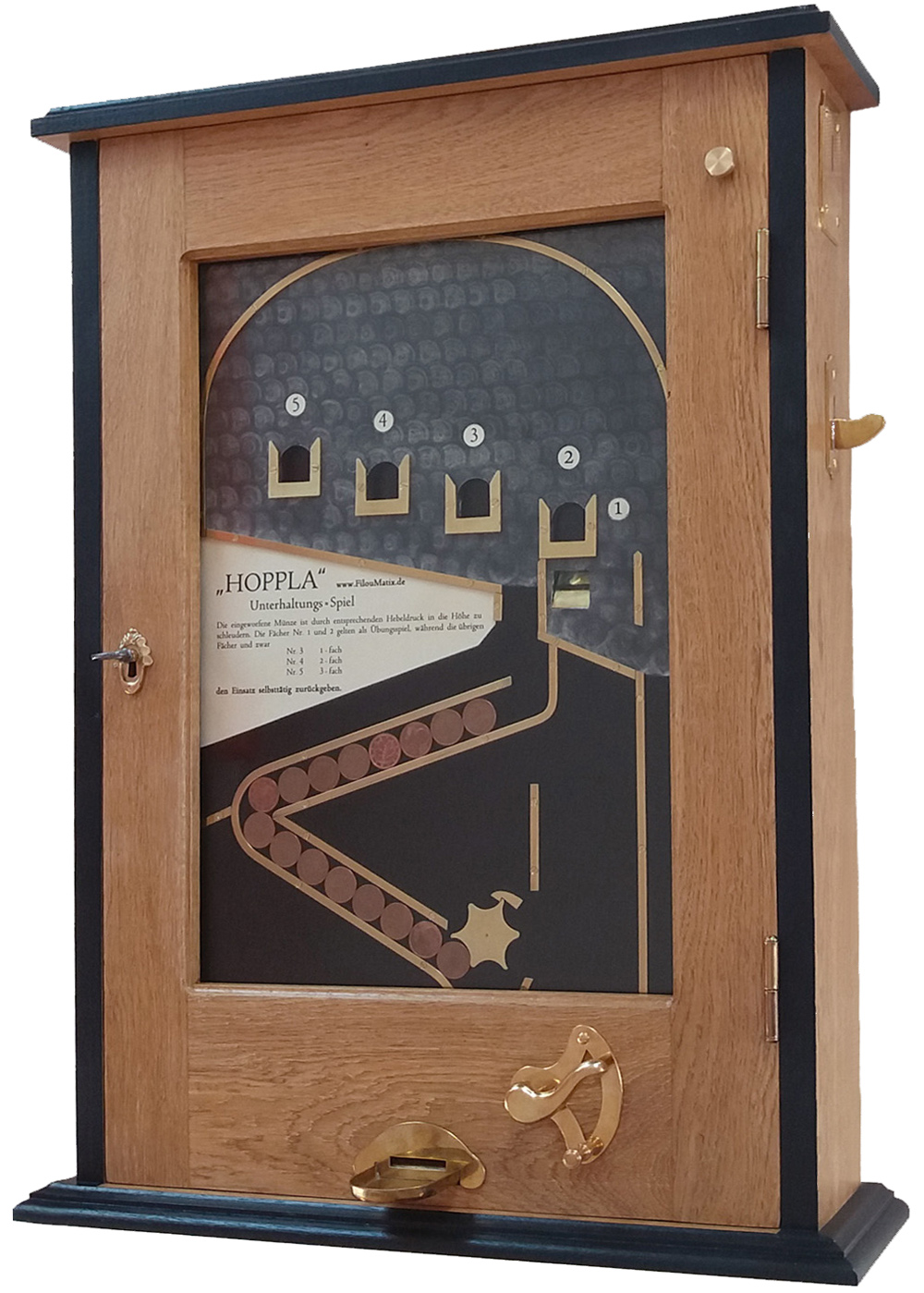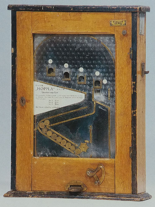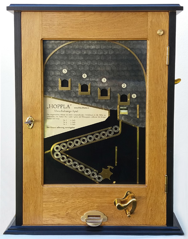 Der Spielautomat >Hoppla< stellt ein spezielle Form eines Münzschleudergrätes dar. Nach Einwurf einer Spielmarke fällt diese in das Spielfeld nach unten zur Abschussvorrichtung. Durch Betätigung des Abzugshebels mit einer variablen Kraft wird die Spielmarke nach oben geschleudert und von der Bogenschiene abglenkt. Der Spieler muss versuchen, die Kraft am Abzugshebel so zu variieren, dass die Spelmarke in eines der Fächer ein bis fünf fällt. Gelingt dieses, so werden eins bis drei Spielmarken ausbezahlt. Wobei die Fächer eins und zwei als Übungsfach gelten und die Spielmarke zur Abschussvorrichtung für einen erneuten "Schuss" zurückfällt.